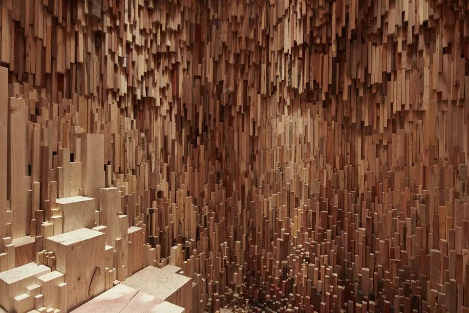 “樹洞”內(nèi)部是一個內(nèi)向的冥想式的空間,無論是坐著還是站著,人都會發(fā)現(xiàn)自己被歷史所環(huán)抱。設(shè)計集合了成千上萬不大不同的木塊,拼湊成一個無垠浩瀚的樹之宇宙,產(chǎn)生了特有的肌理、光暈和鐘乳石一般的形體。
