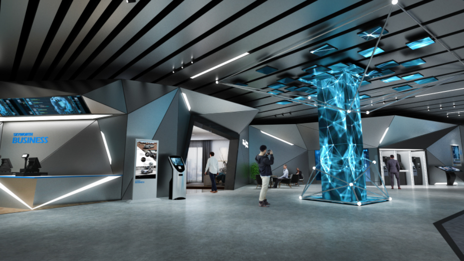 灰色象征著誠懇、沉穩(wěn)、考究。在工業(yè)主題展廳的設(shè)計當(dāng)中,設(shè)計師喜歡融入灰色來表達(dá)工業(yè)的厚重感與穩(wěn)定性的特點(diǎn)。