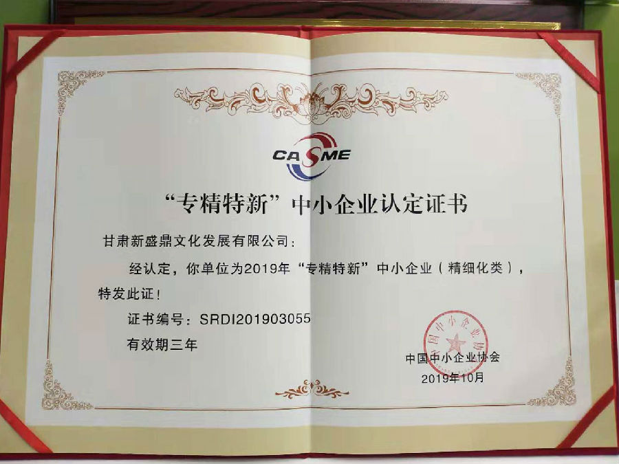 刪繁就簡(jiǎn)三秋樹,領(lǐng)異標(biāo)新二月花。專注創(chuàng)新,深耕文化。近日,由中國(guó)中小企業(yè)協(xié)會(huì)舉辦的2019年度“專精特新”中小企業(yè)評(píng)定結(jié)果新鮮出爐,盛鼎文化集團(tuán)旗下甘肅新盛鼎文化發(fā)展有限公司榜上有名。這是該企業(yè)繼摘得“文化產(chǎn)業(yè)創(chuàng)新型企業(yè)”之后榮獲的又一個(gè)全國(guó)性的榮譽(yù)稱號(hào)。