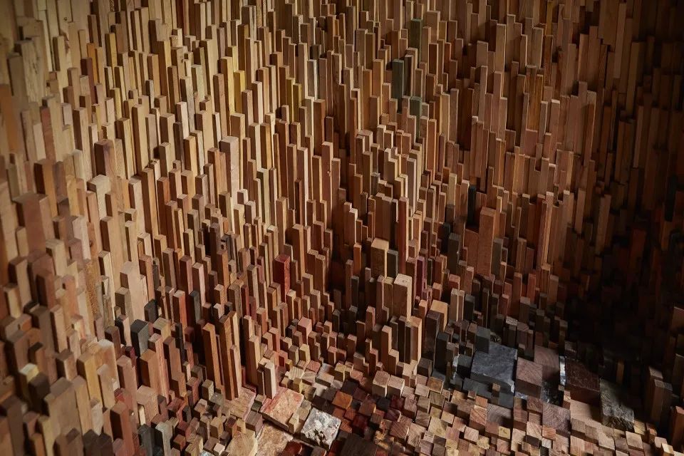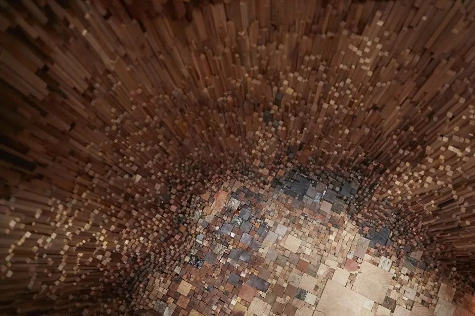 “樹洞”內(nèi)部是一個內(nèi)向的冥想式的空間,無論是坐著還是站著,人都會發(fā)現(xiàn)自己被歷史所環(huán)抱。設(shè)計集合了成千上萬不大不同的木塊,拼湊成一個無垠浩瀚的樹之宇宙,產(chǎn)生了特有的肌理、光暈和鐘乳石一般的形體。