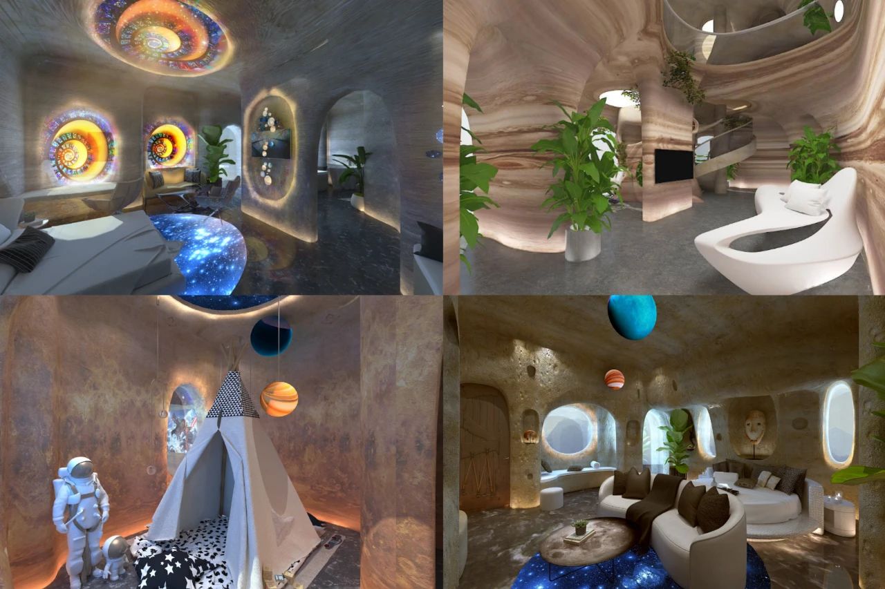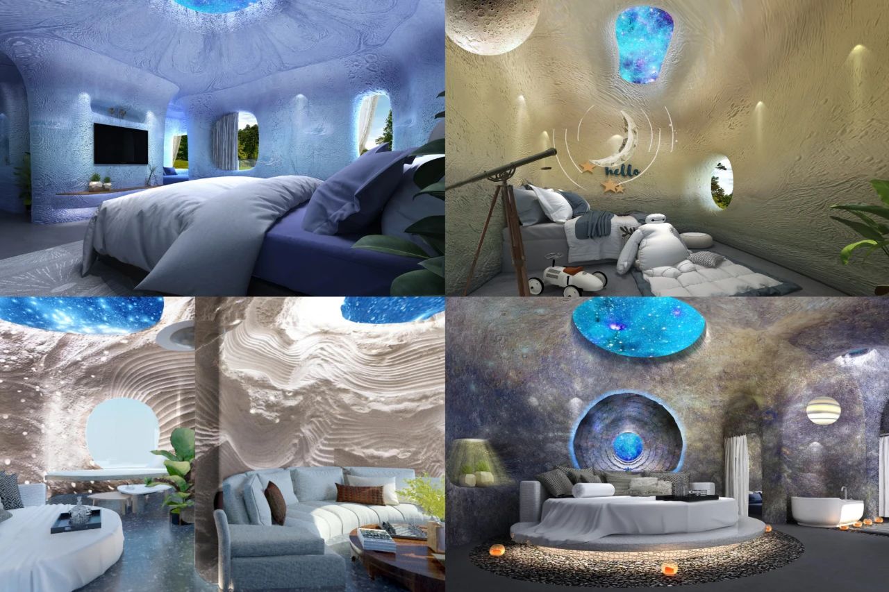 設(shè)計(jì)將剛性線條、原石肌理、不規(guī)則坑洞等變幻各異的質(zhì)地特寫(xiě),鑲嵌進(jìn)自然流動(dòng)的弧形內(nèi)壁上,從橙紅色的火星到湖藍(lán)色的海王星,無(wú)不精妙呈現(xiàn)了行星的原貌。入住其中,超強(qiáng)的沉浸氛圍,讓游客體驗(yàn)到前所未有的“出世”感。