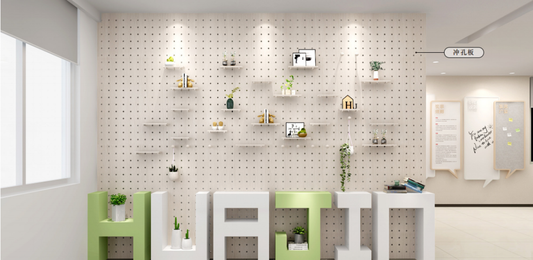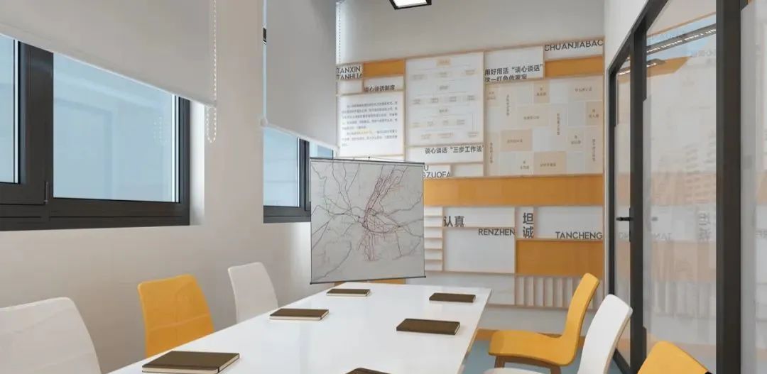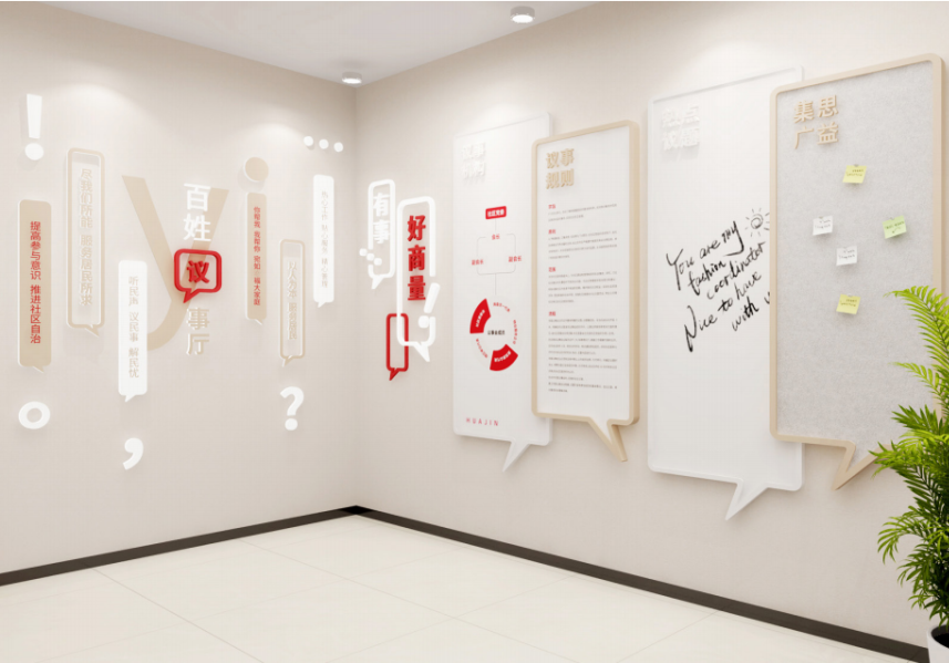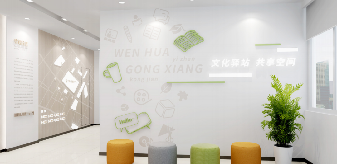 以白色為主基調(diào),增強視覺效果,拓寬視野。點綴以紅、綠色,點亮整體空間,明亮活潑,年輕活力十足。黨建文化與社區(qū)特色相融合,讓黨群服務(wù)中心成為一處亮點。