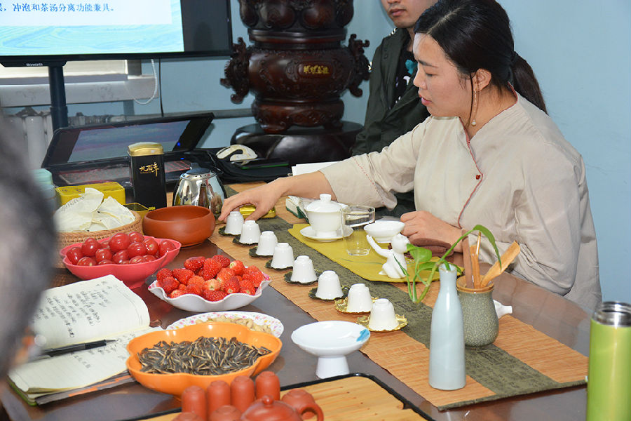 授課中楊老師以講解+演練的形式進(jìn)行授課 ,不僅對(duì)茶藝知識(shí)做了系統(tǒng)、科學(xué)、嚴(yán)謹(jǐn)?shù)闹v解,讓我們了解茶葉的演變史,懂得分清六大茶類,掌握不同的泡飲方式等基礎(chǔ)知識(shí),而且還講解了茶事服務(wù)流程及禮儀標(biāo)準(zhǔn),從行禮入座,再到泡茶奉茶,環(huán)環(huán)相扣,實(shí)用性極強(qiáng)。
