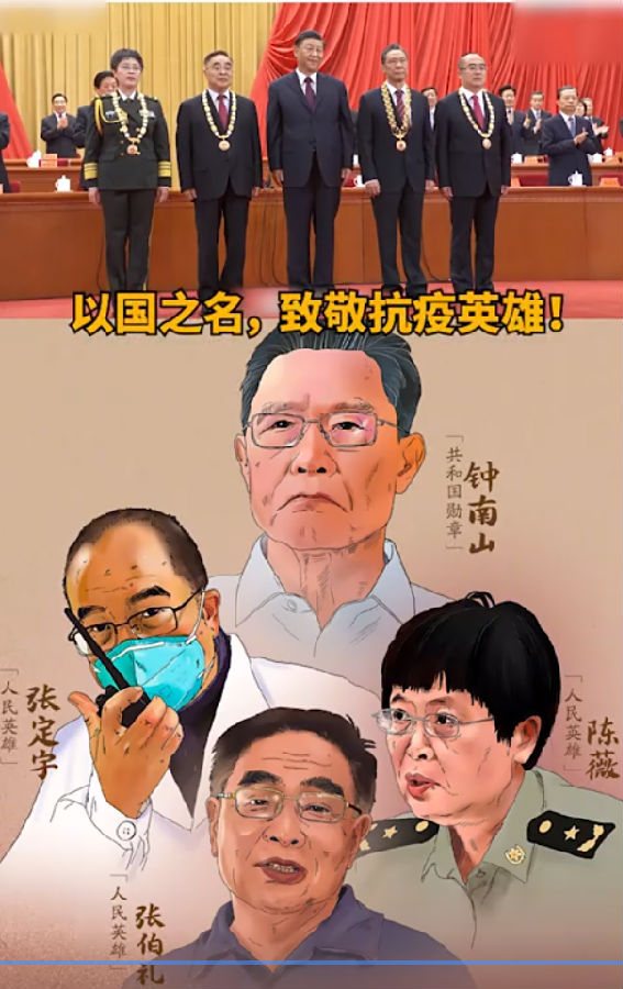 全國抗擊新冠疫情表彰大會為國家勛章和國家榮譽稱號獲得者頒授勛章獎?wù)?。鐘南山獲授共和國勛章,張伯禮,張定宇,陳薇獲授人民英雄稱號??挂叨窢?,艱苦卓絕,你們的貢獻,共和國不會忘記,人民不會忘記!