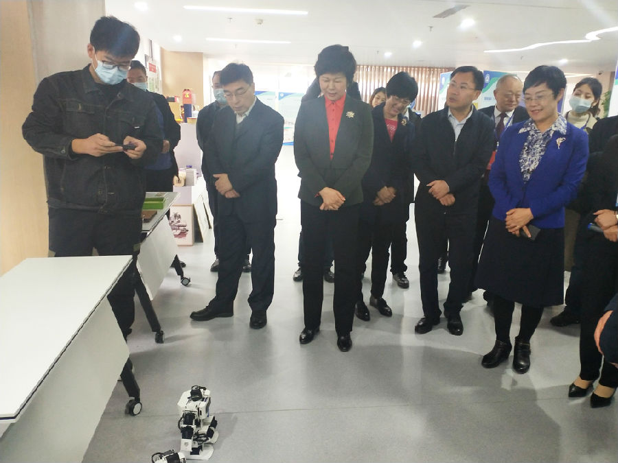 省委組織部副部長、省人社廳廳長周麗寧在蘭州創(chuàng)業(yè)大學(xué)工作展上實地查看創(chuàng)業(yè)項目成果。