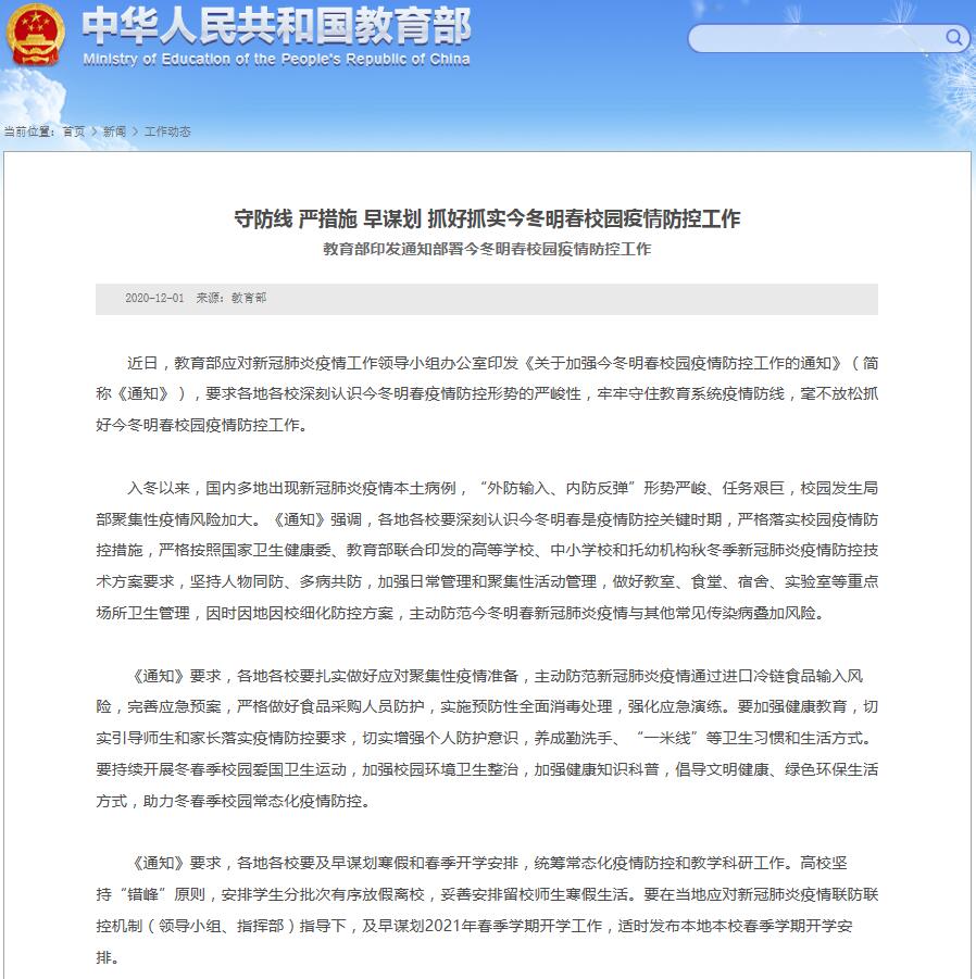 教育部印發(fā)通知部署今冬明春校園疫情防控工作